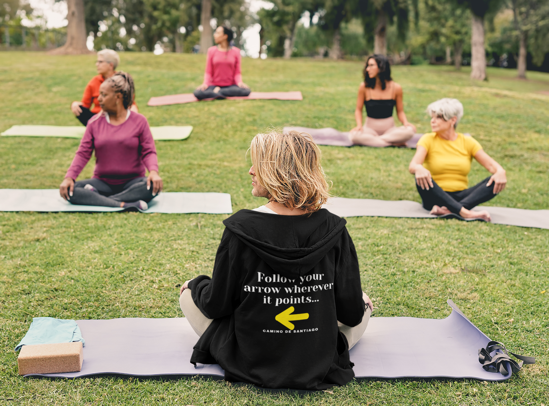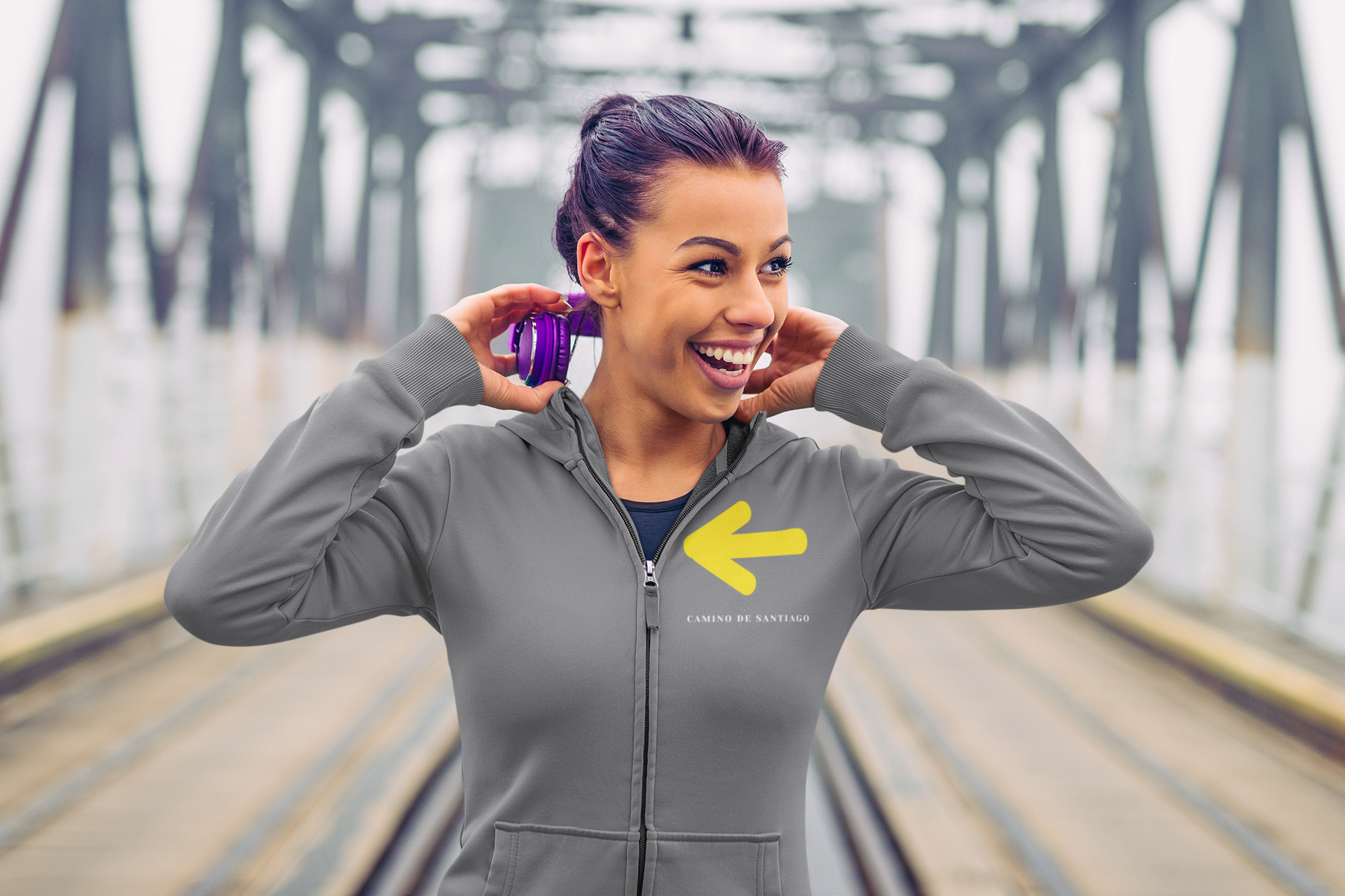 The design of this zippered Hoodie is unique, with a yellow arrow on the front, one of the symbols of the Camino and the Follow Your Arrow Wherever It Points and a Camino arrow on the back.