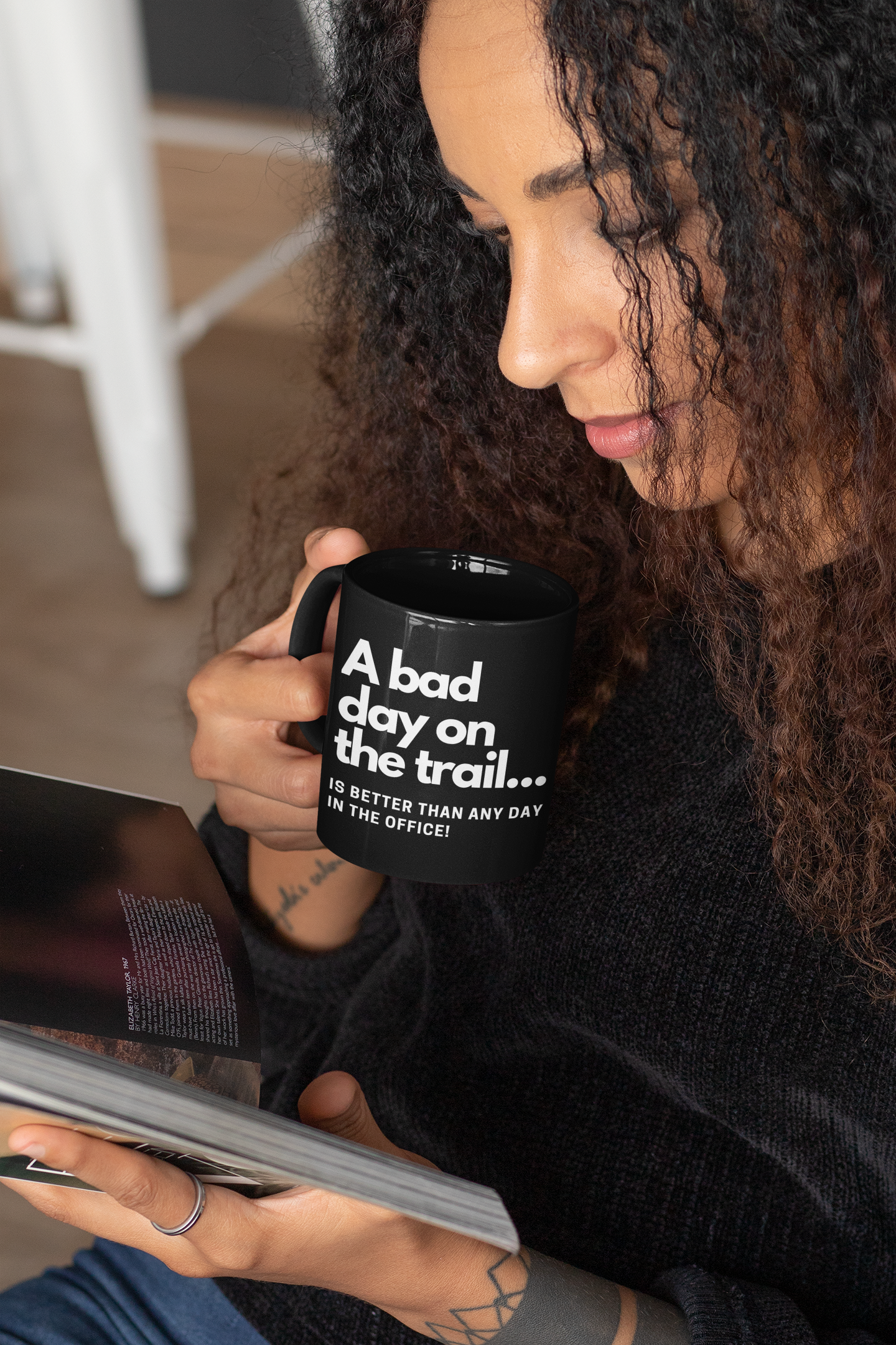 Sarcastic Coffee Mug – A Bad Day on the Trail is better than any day in the office. (Black Ceramic)